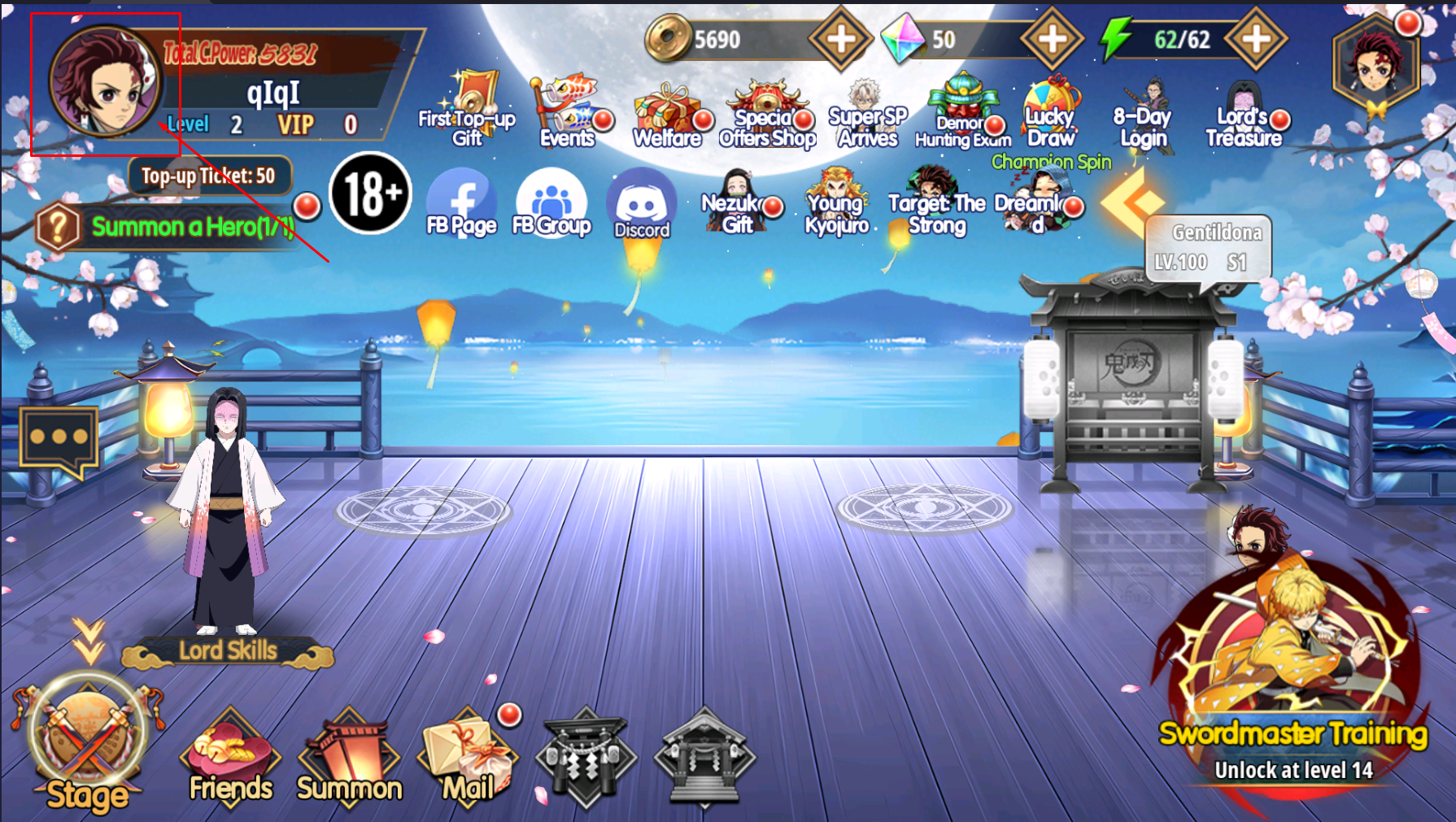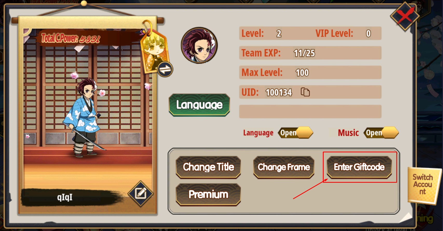 - On the main screen interface, Swordsmen will see their character’s avatar in the top left corner. Click on the avatar to find the “Enter Giftcode” button.