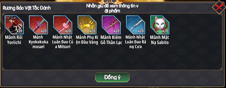 | 379$ | Rương Siêu SP Ước Mơ Chọn 10 Mảnh x6, Tsuba- Đỉnh x1, Rương Bảo Vật CD Kỹ Năng x2, Rương Đá Cấp 6 x1 | |||||||