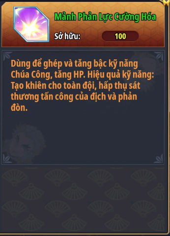 | Top 2 | x | Mảnh Phản Đòn Cường Hóa x100 Mảnh Sách Viêm Trụ x40 Rương Đá Cấp 7 x1 Rương Chiến Hồn Chọn x150 |
